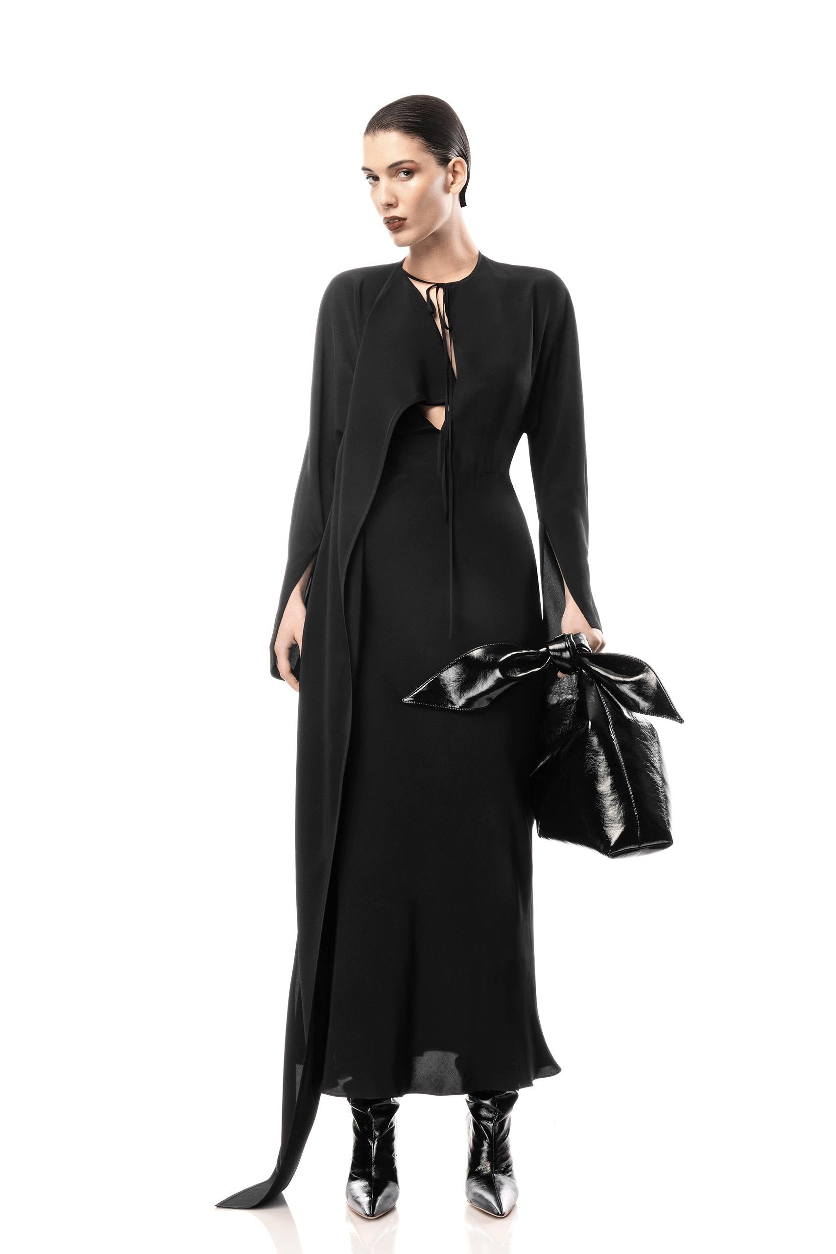 This maxi dress features haterneck with scarf along it, vast cut out at the front and side concealed zipper fastening.