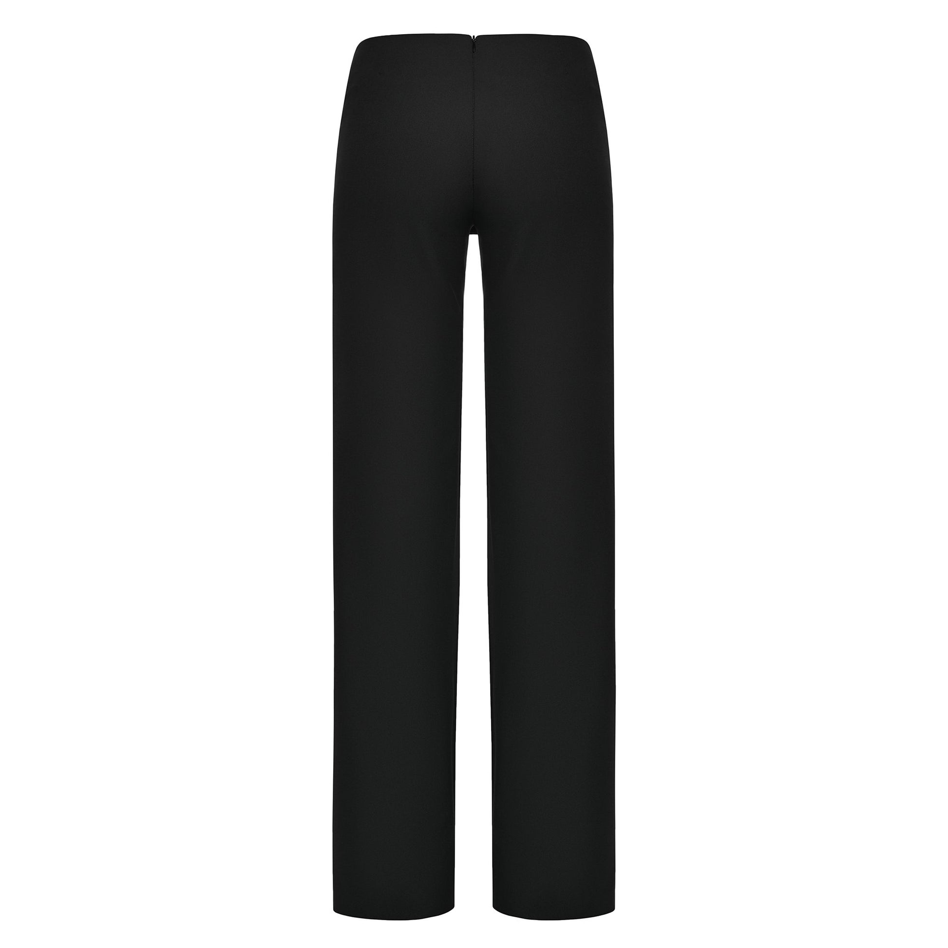 Black tailored trousers feature a sleek mini-skirt overlay for a sculpted, modern silhouette with a refined straight-leg cut. Finished with smooth welt-style detailing. Fits true to size. Take your normal size. Designed and made in Tbilisi, Georgia.