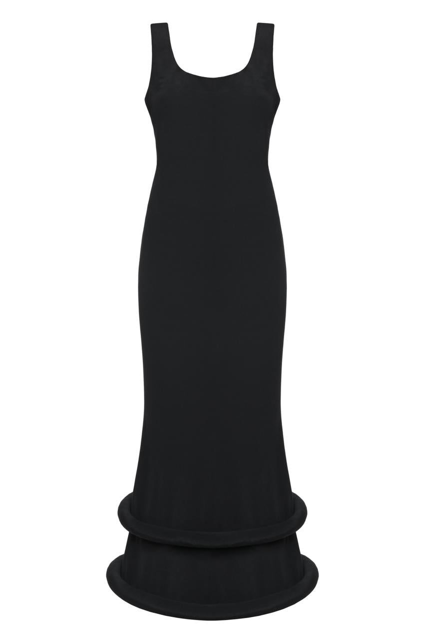 This sleek maxi dress offers a minimalist silhouette with a sculptural twist. Defined by its clean lines and avant-garde detailing, it is a versatile statement piece for a modern wardrobe.